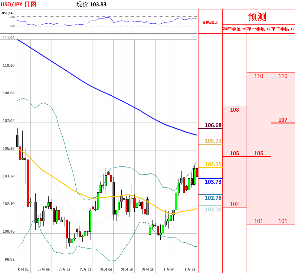 昨日,美元兑日元震荡反弹,一度向上突破上周高点,但未能站稳,收盘于上周高点附近。目前,短期均线呈多头排列,但中长期趋势仍旧偏空。此外,日线、4小时动能指标发出回调迹象,因此今日回调的可能性较大。今日,上方关注昨日高点104.48阻力位,下方关注100日均线主要支撑位。如果向上突破昨日高点,汇率将会测试105的阻力;但如若跌破100日均线,美元/日元将试探10日均线和布林带中轨的支撑。