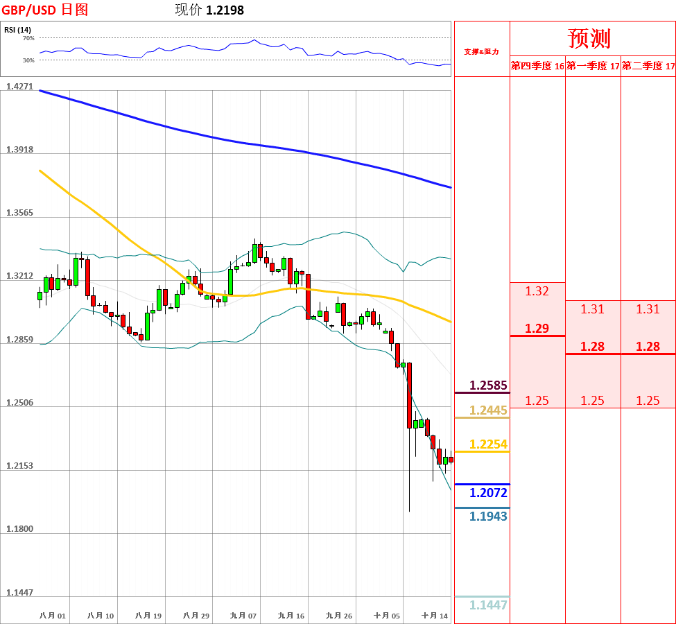 昨日,英镑兑美元回调至周三低点附近后反弹至5日均线附近,收了带有下影线的小阳线。目前,短中长期均线呈空头排列,空头趋势保持完好,但日线MACD绿柱变小,因此不排除震荡反弹的可能性。今日,上方关注周三高点1.2325阻力位,下方关注1.2200支撑位。如果向上突破1.2325,汇率将会测试1.2400的阻力;但如若跌破1.2200,英镑/美元将再次试探1.2105和1.2089主要支撑位。