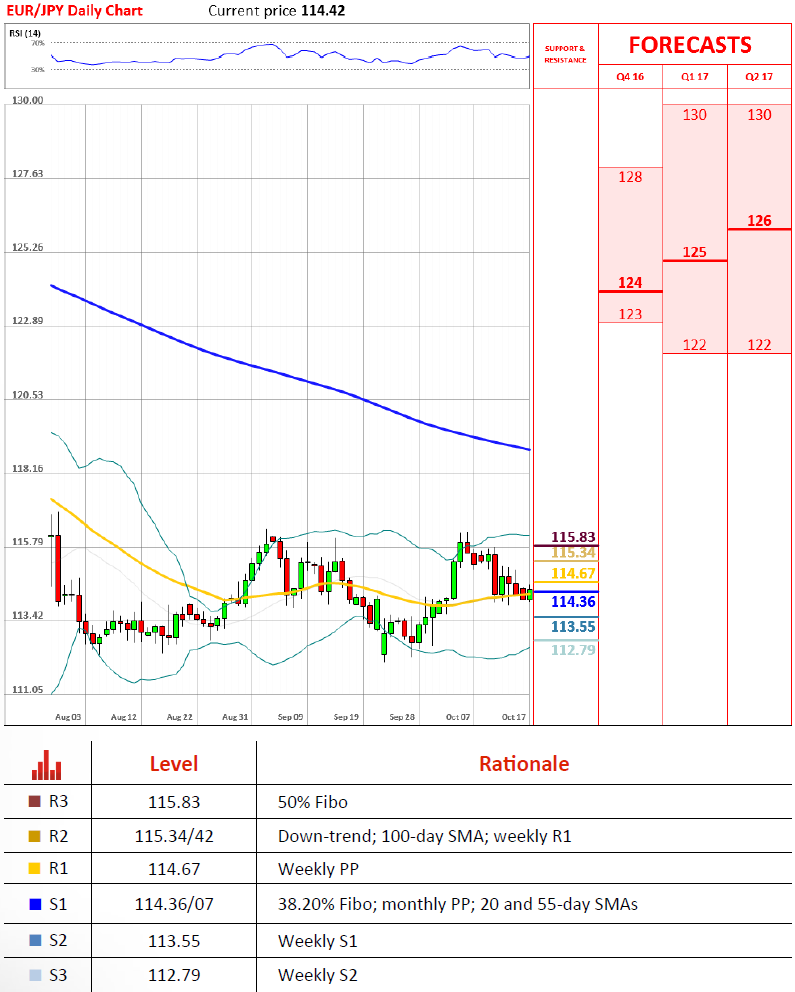 欧元/日元再次走跌,不过跌幅略小于预期,只是沉下38.2%斐波(114.36)。不论如何货币对今天开盘小幅跳高,这样斐波38.2%再次成为支撑位,还是被月PP,20/55日线加强。最终该货币对跌下114.00的可能性并不大。而由于斐波线在周五已经一度被破,因此再破一次的可能性也依旧存在。不过技术指标目前给出混杂信号,因此不能排除汇价可能反弹冲向周PP 114.67。