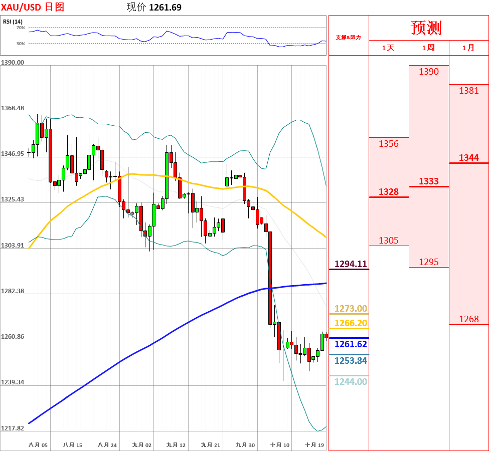 昨日,黄金震荡反弹,收了带有上影线的小阳线;目前,短期走势偏空,但中期趋势偏多。近期,价格未能有效跌破61.80%回撤率1249并且反弹,而且日线动能指标拐头向上,因此不排除触底反弹的可能性。今日,上方关注200日均线主要阻力位,下方关注5日、10日均线支撑位。如果向上突破200日均线,金价将会反弹至布林带中轨附近;但如若跌破10日均线,黄金将会再次测试1249主要支撑位。今日公布美联储公布经济状况褐皮书。