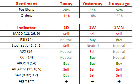 "我们在1.05,是一个很狭窄的范围。"- Alan Ruskin, global co-head of foreign-exchange research in New York at Deutsche Bank(基于:Bloomberg) 货币对展望 昨日,欧元兑美元向上突破5日均线后遇阻回落,测试7月低点1.0952主要支撑位,但未能下破,收了带有上下影线的小阴线。目前,中长期走势以低位宽幅震荡为主,短期趋势偏空,但4小时MACD出现底背离,因此不排除震荡反弹的可能性。今日,上方关注昨日高点1.1005阻力位,下方关注1.0952主要支撑位。如果向上突破昨日高点,汇率将会向10日均线靠拢;但如若跌破7月低点,欧元/美元将逐步跌至英国退欧公投当日低点1.0911。今日关注欧洲央行利率决议和欧洲央行行长德拉基的新闻发布会。 交易者情绪 今日,多头头寸增加2%,至56%;卖单增加了1%,至58%。