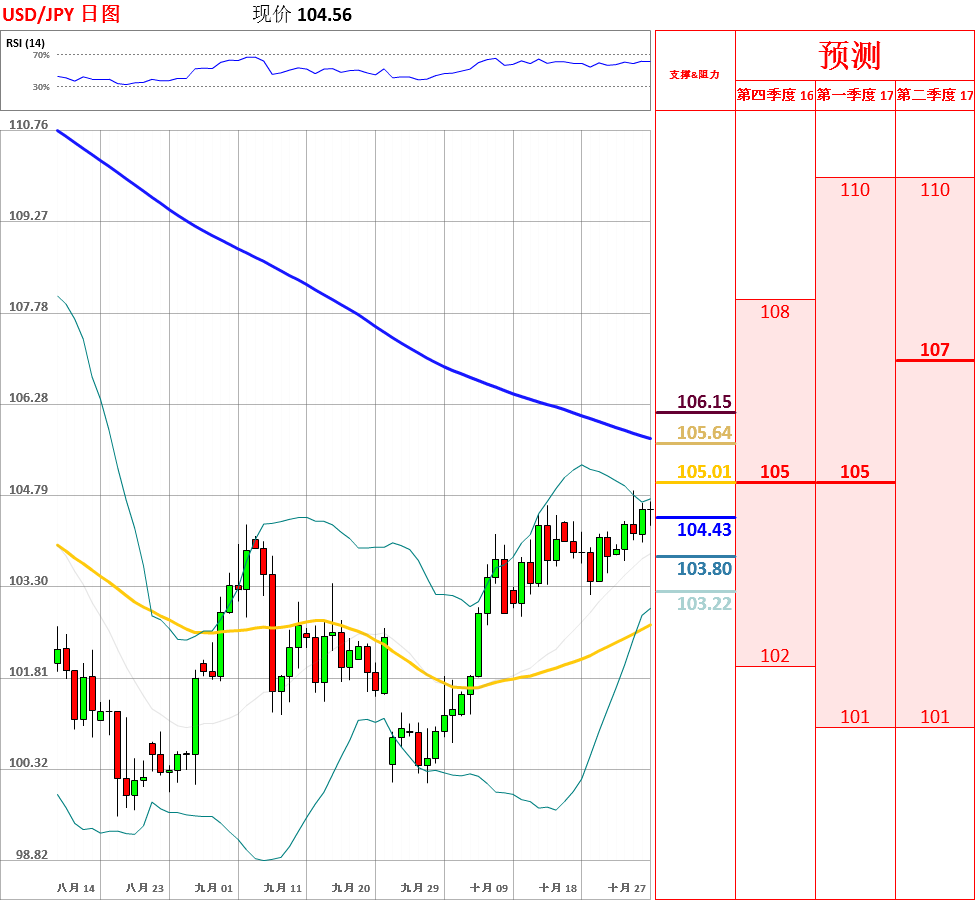 昨日,美元兑日元震荡反弹,收了小阳线。近期,汇率在突破100日均线后维持区间震荡,而且日线MACD基本持平。目前,短中长期均线再次形成多头排列,因此不排除反弹的可能性。今日,上方关注周二高点104.87,下方关注布林带中轨支撑位。如果向上突破104.87,汇率将会测试105和106阻力位;但如若跌破布林带中轨,美元/日元将试探100日均线主要支撑位。