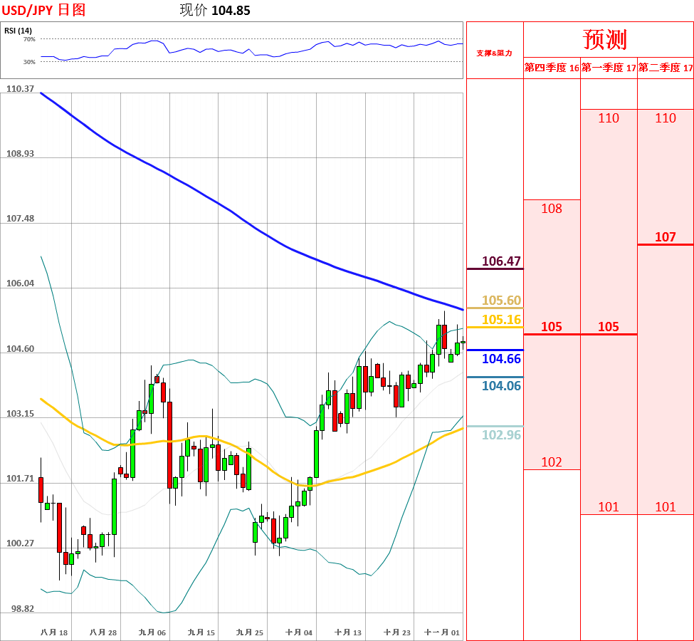 昨日,美元兑日元反弹至105上方后小幅回落,收了带有上影线的阳线。近期,汇率100附近触底反弹,一度站上100日均线,短期均线形成多头排列,短期走势总体以震荡上行为主,但中长期趋势仍旧偏空。此外,日线动能指标有转空迹象,因此不排除回落的可能性。今日,上方关注昨日高点105.23阻力位,下方关注10日均线支撑位。如果向上突破昨日高点,汇率将会测试上周高点105.53的阻力;但如若跌破10日均线,美元/日元将试探20日均线和布林带中轨支撑位。