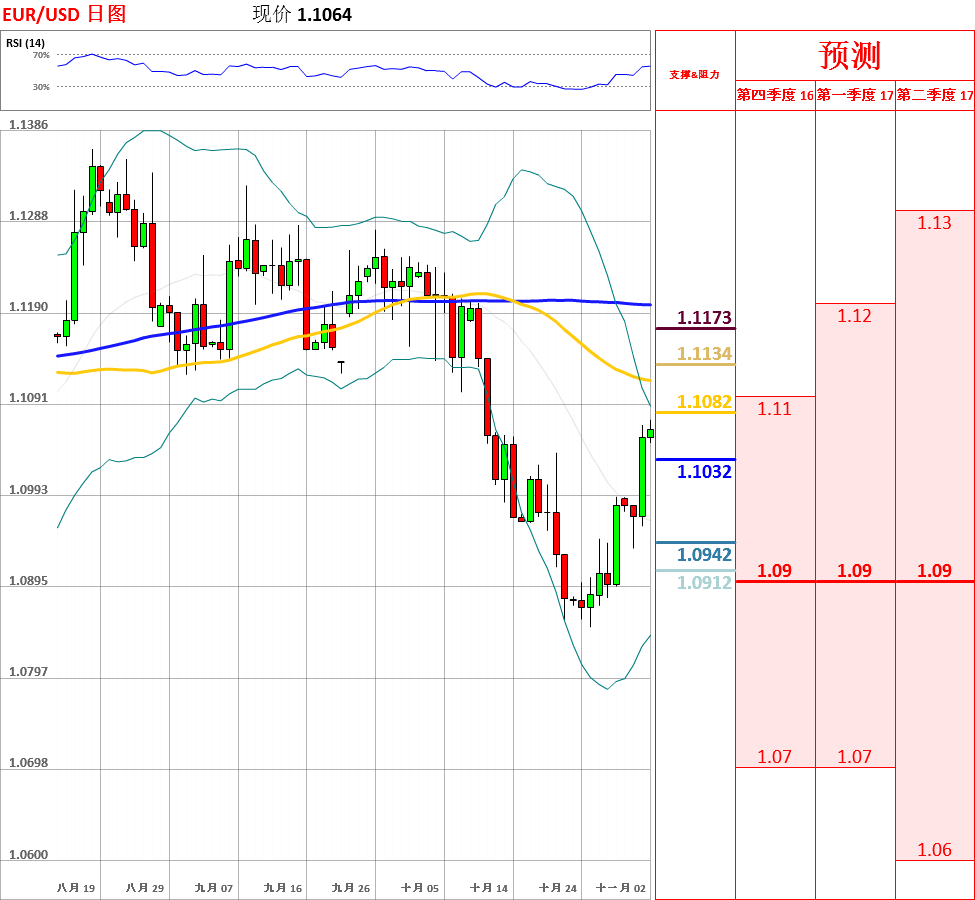 昨日,受到美元大幅走弱的影响,欧元兑美元一度向上突破20日均线和布林带中轨,收了大阳线,涨幅为0.65%。目前,中长期走势依然以低位宽幅震荡为主,但近期汇率在3月低点附近触底反弹,而且短期均线拐头向上,日线MACD红柱变大,因此不排除继续反弹的可能性。今日,上方关注1.1100主要阻力位,下方关注布林带中轨支撑位。如果有效地向上突破1.1100,汇率将逐步反弹至100日均线附近;但如若跌破布林带中轨,欧元/美元将会测试20日和5日均线支撑位。今日公布欧元区10月制造业PMI终值。
