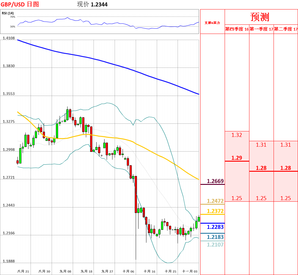 昨日,英镑兑美元向上突破短期震荡区域后遇阻回落,收了带有上影线的小阳线。目前,中长期空头趋势保持完好,短期走势震荡反弹但总体以区间震荡为主。今日,上方关注昨日高点1.2354阻力位,下方关注短期均线支撑位。如果向上突破昨日高点,汇率将测试1.2400阻力位;但如若跌破短期均线,英镑/美元将试探本周低点1.2143支撑位。此外,4小时动能指标偏多,日线动能指标转多,因此不排除继续反弹的可能性。今日,重点关注英国央行利率决定、会议纪要及季度通胀报告。