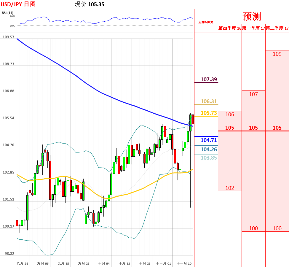 昨日,受到美国大选导致避险情绪攀升及美元大幅波动的影响,美元兑日元向下突破短中长期均线后大幅反弹,收了带有长下影线的小阳线。近期,汇款以缓慢的速度震荡反弹,一度站上100日均线及布林带中轨。但是,鉴于4小时MACD出现顶背离,而且中长期趋势偏空,因此不排除下跌的可能性。今日,上方关注上周高点105.53阻力位,下方关注5日及10日均线支撑位。如果向上突破上周高点,汇率将会测试昨日高点105.89阻力位;但如若跌破10日均线,美元/日元将试探布林带中轨的支撑。