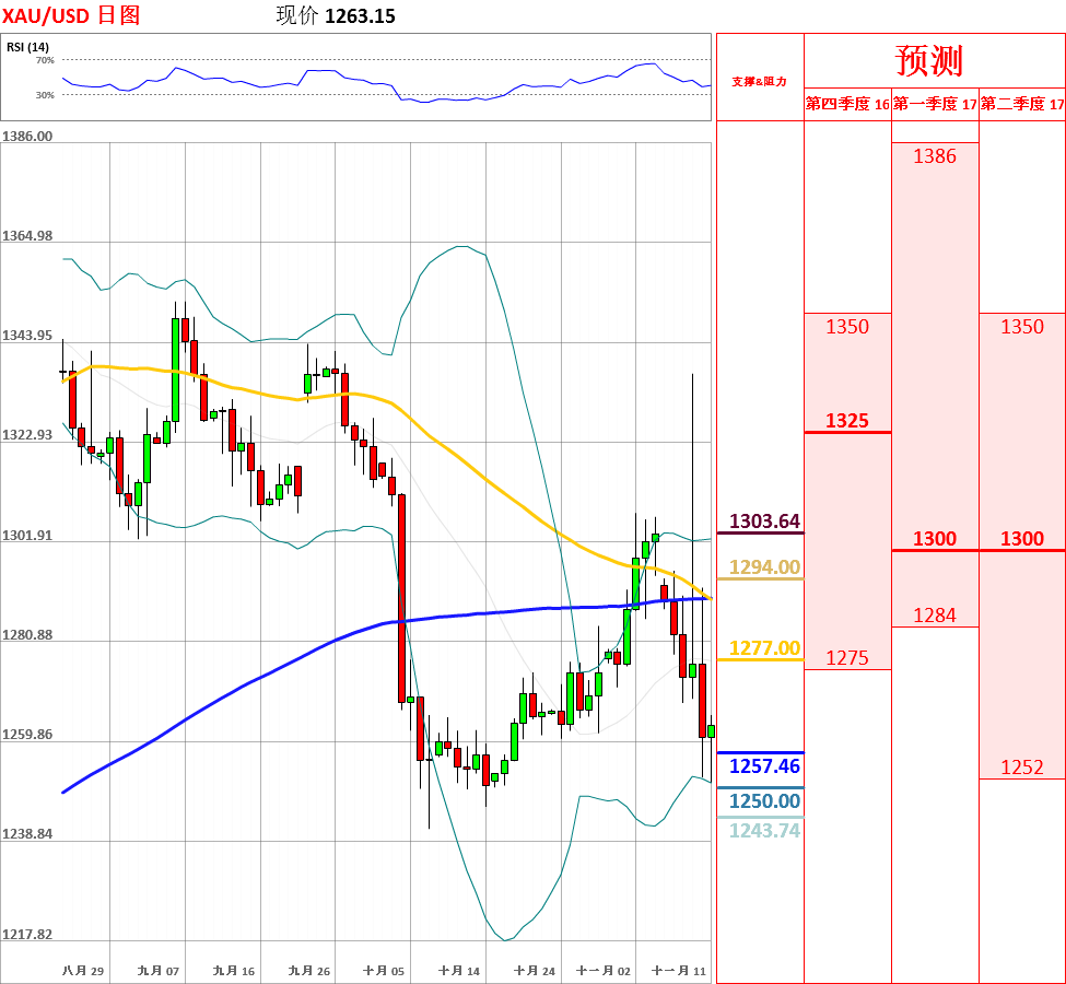 昨日,黄金先涨后跌,一度向下突破短期均线、布林带中轨和短期上升趋势线,收了带有长上影线的中阴线,短期走势由震荡反弹再次转空,但中期趋势偏多。目前,日线MACD红柱变小、绿柱变大,短期内存在继续下跌的可能性。近期,金价的走弱主要来源于美联储12月加息概率上升、美元走强以及市场对特朗普执政的悲观态度有所削减。今日,上方关注5日均线阻力位,下方关注61.80%回撤率1249主要支撑位,如果向上突破5日均线,价格将会测试1280阻力位;但如若跌破1249,黄金将试探10月低点1241.39的支撑。
