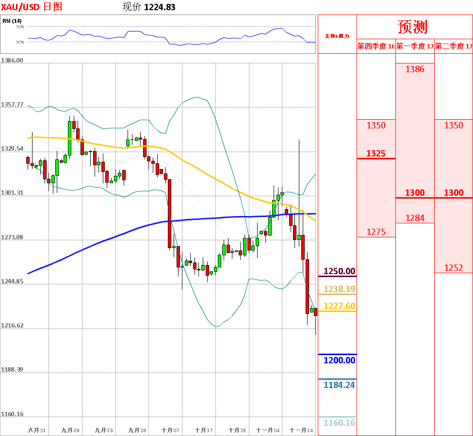 "由于市场预计美元将会进一步上涨以及美联储将在12月加息,黄金在周一下跌1%,创下5个月新低。"- Apeksha Nair, Reuters