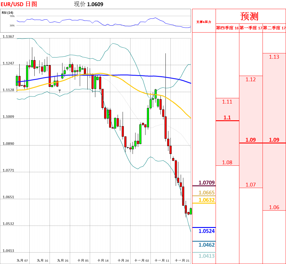 周五,欧元兑美元震荡下跌,收了带有上下影线的阴线,周线收了中阴线。目前,短中长期均线呈空头排列,趋势总体震荡偏空。但是,鉴于汇率创下新低后4小时MACD出现底背离,因此不排除反弹的可能性。今日,上方关注5日均线阻力位,下方关注上周低点1.0569支撑位。如果向上突破5日均线,汇率将会逐步反弹至1.0700附近;但如若跌破上周低点,欧元/美元将测试去年12月低点1.0522主要支撑位。