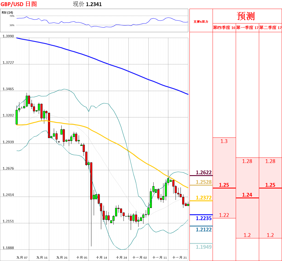 周五,英镑兑美元震荡下跌,一度向下突破布林带中轨和20日均线,收了带有上下影线的阴线,周线收了中阴线。目前,短期均线拐头向下,日线动能指标拐头向下,汇率存在继续下跌的可能性。今日,上方关注布林带中轨阻力位,下方关注短期上升趋势线1.2295主要支撑位。如果向上突破布林带中轨,汇率将会测试10日均线阻力位;但如若跌破短期上升趋势线,英镑/美元将会试探1.2250支撑位。