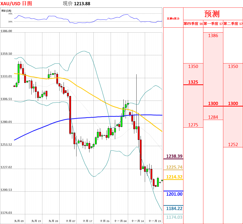 昨日,黄金震荡回落,收了带有上下影线的小阴线。目前,短中期均线依然呈空头排列,走势总体震荡偏空。但是,鉴于日线、4小时动能指标拐头向上,因此不排除反弹的可能性。今日,上方关注10日均线主要阻力位,下方关注昨日低点1206.13支撑位。如果向上突破10日均线,价格将会测试1225和1230阻力位;但如若跌破昨日低点,黄金将测试上周低点1202.90的支撑。今日公布 美国至11月19日当周初请失业金人数和11月Markit制造业PMI初值。
