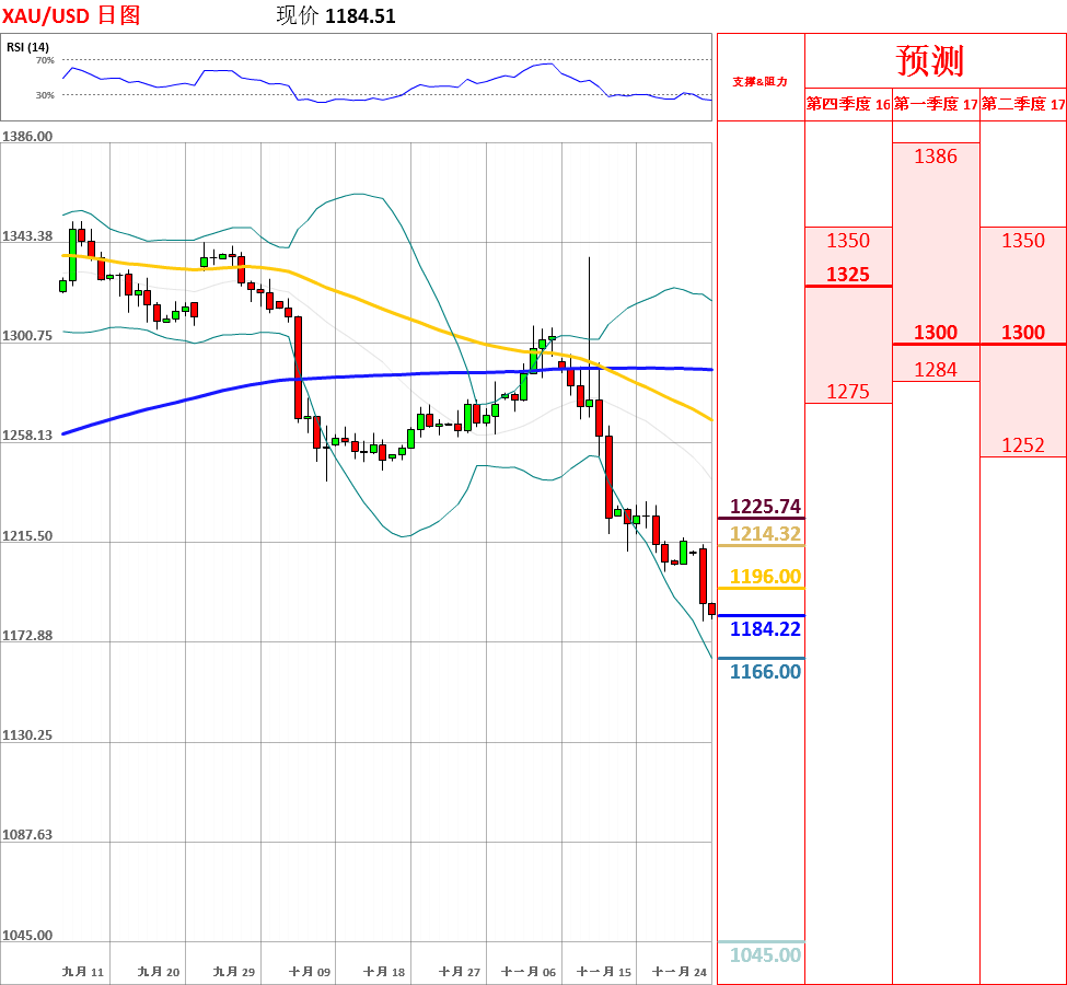 昨日,受到美联储11月会议纪要和经济数据的影响,美元指数创14年新高,黄金向下突破1200主要支撑位,创9个月新高。目前短中期均线呈空头排列,200日均线拐头向下,走势总体偏空。但是,鉴于日线、4小时动能指标超卖,因此不排除反弹的可能性。今日,上方关注1200阻力位,下方关注38.20%回撤率1172主要支撑位。如果向上突破1200,价格将会测试50%回撤率1210阻力位;但如若跌破1172,黄金将跌破1170。