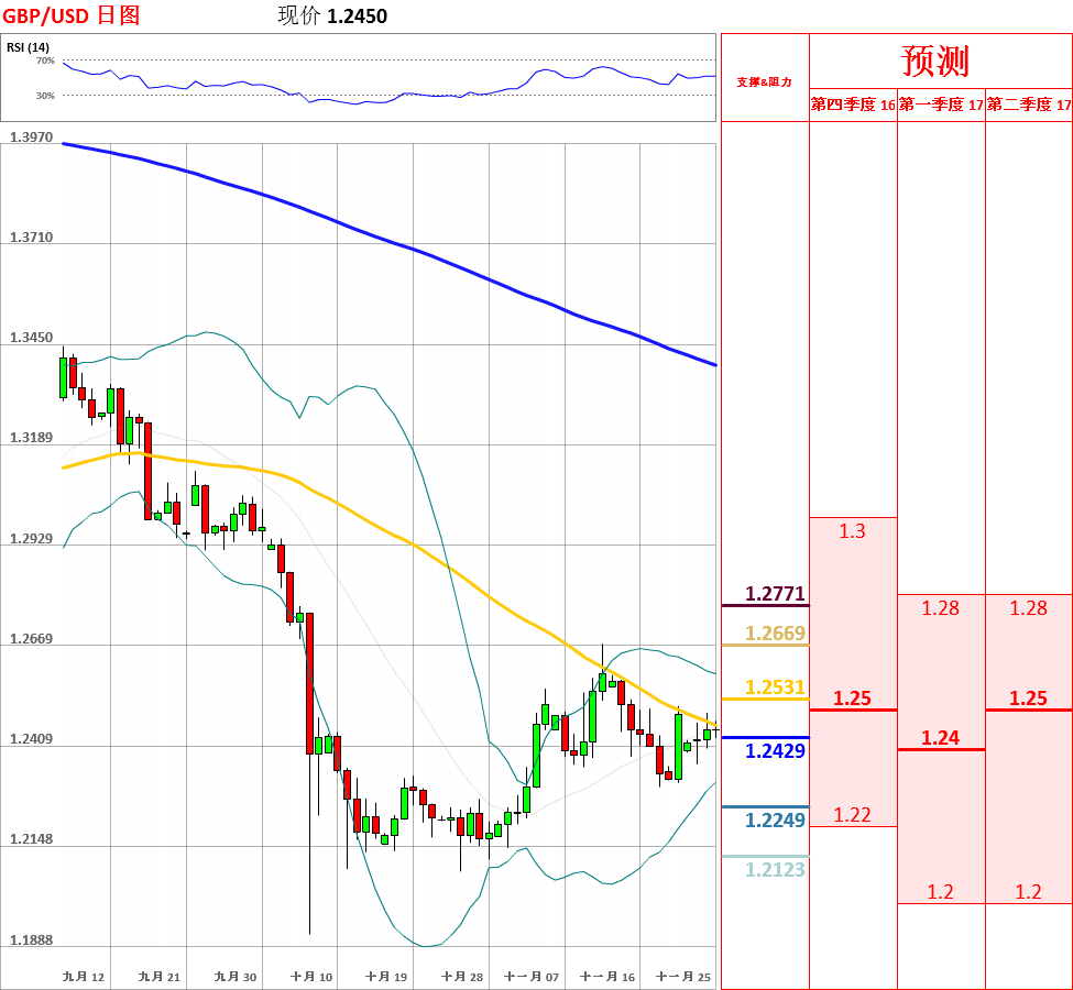 昨日,英镑兑美元窄幅震荡于1.241只1.2495,收了带有上下影线的小阳线。目前,短期走势以缓慢反弹为主,但中长期趋势仍旧偏空。然而,鉴于日线、4小时MACD快线及慢线持平,因此不排除区间震荡的可能性。今日,上方关注本周高点1.2512阻力位,下方关注短期上升趋势线1.2361主要支撑位。如果向上突破1.2512,汇率将会测试55日均线主要阻力位;但如若跌破1.2361,英镑/美元将试探本周低点1.2312的支撑。今日公布英国第三季度GDP修正值和11月CBI零售销售差值。