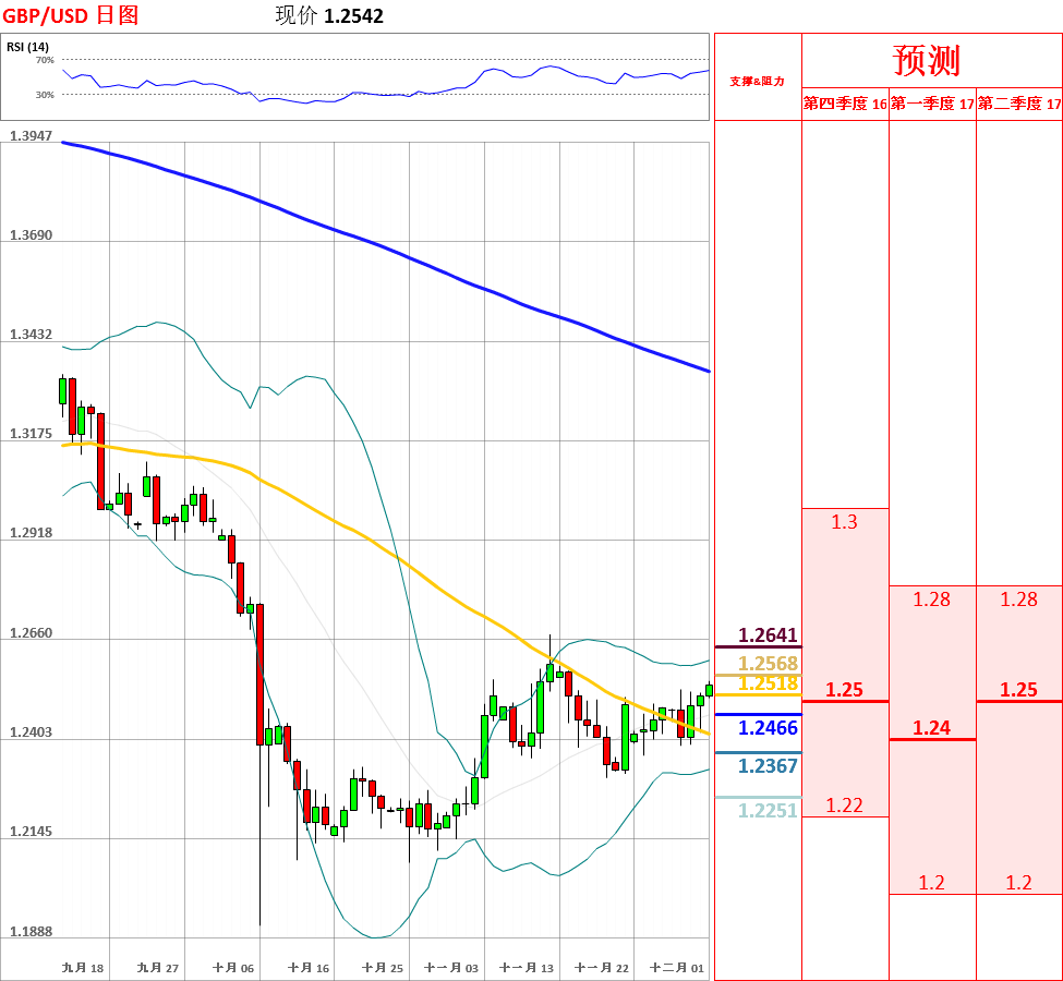 昨日,英镑兑美元先跌后涨,收了带有长下影线的小阳线;今日亚盘时段汇率突破55日均线。目前,中长期趋势偏空,短期走势震荡反弹,形成上升趋势线;但是,鉴于短期均线粘合,因此不排除区间震荡的可能性。今日,上方关注前期高点1.2557阻力位,下方关注短期均线支撑位。如果向上突破1.2557,汇率将会测试1.2600和本月高点1.2673主要阻力位;但如若跌破短期均线,英镑/美元将试探短期上升趋势线1.2403支撑位。今日公布英国11月制造业PMI。