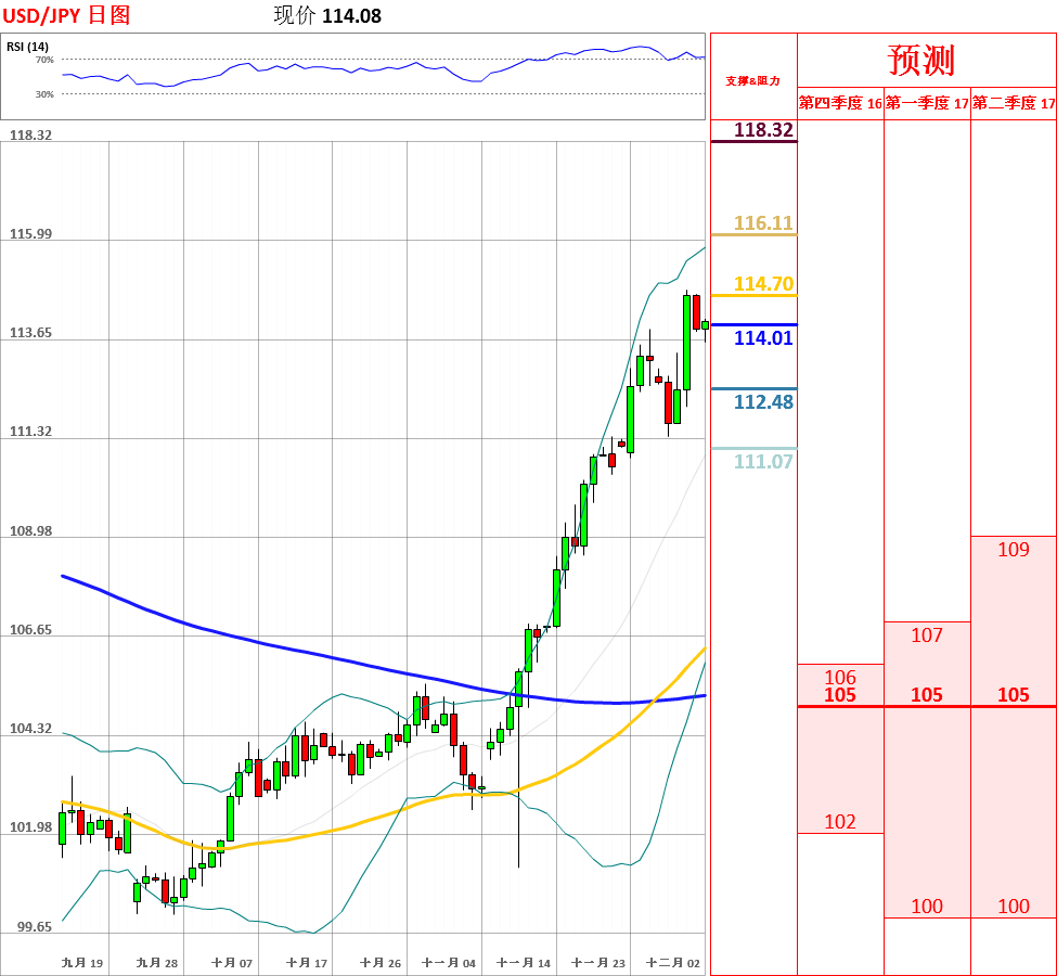 昨日,美元/日元涨至今年2月高点附近后,遇阻回落,收了带有上下影线的小阴线。目前,短中期均线呈多头排列,200日均线开始持平,走势总体震荡偏多。但是,鉴于日线、4小时MACD红柱变小,因此不排除回调的可能性。今日,上方关注2月高点114.87主要阻力位,下方关注5日均线支撑位。如果向上突破114.87,汇率将会突破115.00关口;但如若跌破5日均线,美元/日元将试探10日均线的支撑。