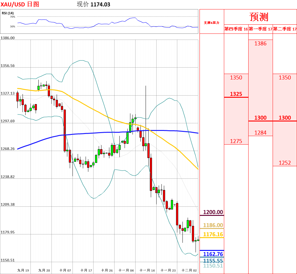 昨日,在亚盘时段受到中国可能限购黄金消息的影响,金价下跌10美元,但遇到1160的支撑,震荡反弹,收了下影线长于上影线的小阴线。目前,短中期均线呈空头排列,200日均线拐头向下,走势总体偏空。但是,鉴于1160支撑较强,而且日线、4小时MACD绿柱变小,因此不排除反弹的可能性。今日,上方关注1180阻力位,下方关注1170支撑位。如果向上突破1170,价格将会测试10日均线的阻力;但如若跌破1170,黄金将再次测试1160主要支撑位。今日公布美国11月失业率和11月季调后非农就业人口。