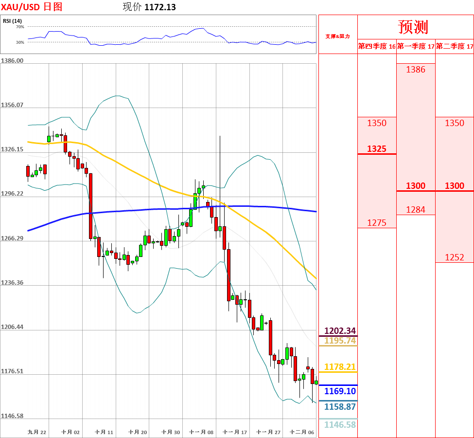 昨日,黄金跌破1160,创下9个月新低,但随后未能站稳小幅反弹,收了下影线长于上影线的阴线。目前,短中期均线呈空头排列,200日均线开始拐头向下,走势总体震荡偏空。但是,鉴于MACD绿柱变小,Stochastic、RSI、CCI超卖后拐头向上,因此不排除反弹的可能性。今日,上方关注10日均线阻力位,下方关注1170支撑位。如果向上突破10日均线,金价将会测试昨日高点1188.06的阻力;但如若跌破1170,黄金将试探1160支撑位。