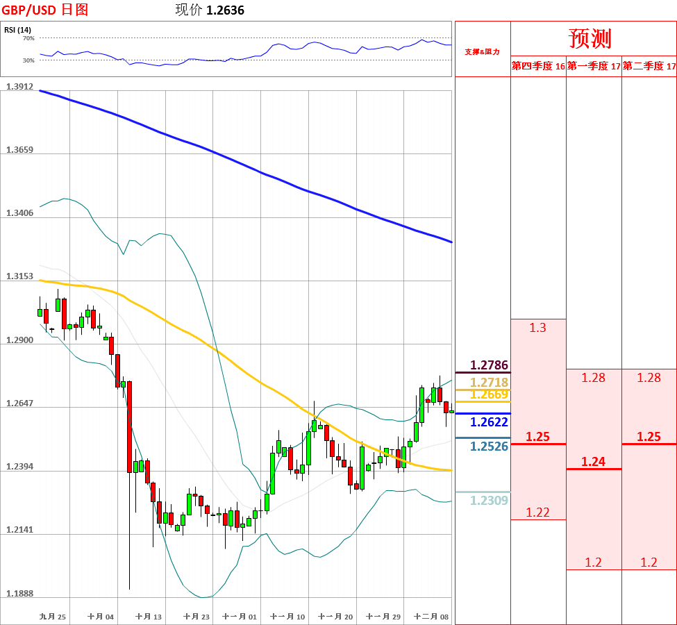 昨日,英镑兑美元震荡回落,收了带有下影线的小阴线。目前,短期均线形成多头排列,走势总体震荡偏多,但鉴于中长期趋势仍旧偏空,因此不排除下跌的可能性。今日,上方关注1.2700阻力位,下方关注10日均线支撑位。如果向上突破1.2700,汇率将会测试100日均线主要阻力位;但如若跌破10日均线,英镑/美元将试探布林带中轨主要支撑位。