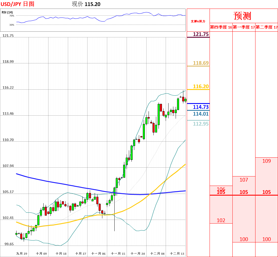 昨日,美元兑日元突破116.00后遇阻回落,收了带有长上影线的小阴线。目前,短重期均线呈多头排列,200日均线略微拐头向上,走势总体震荡偏多。但是,鉴于日线动能指标超买后拐头向下,4小时动能指标开始转空,因此不排除回调的可能性。今日,上方关注115.50阻力位,下方关注5日均线支撑位。如果向上突破115.50,汇率将会测试昨日高点116.12主要阻力位;但如若跌破5日均线,美元/日元将试探10日均线和114.00主要支撑位。