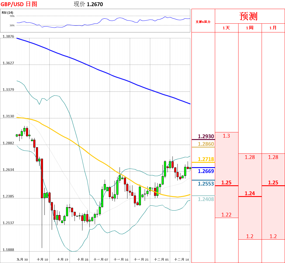 昨日,英镑兑美元冲高回落,收了带有上影线的小阴线。目前,中长期趋势仍旧偏空,短期走势以震荡反弹为主。但是,鉴于日线、4小时动能指标发出不同信号,因此不排除区间震荡的可能性。今日,上方关注昨日高点1.2728阻力位,下方关注布林带中轨支撑位。如果向上突破1.2728,汇率将会测试100日均线主要阻力位;但如若跌破布林带中轨,英镑/美元将试探短期上升趋势线1.2516主要支撑位。今日公布英国11月失业率、11月失业金申请人数、10月三个月ILO失业率。