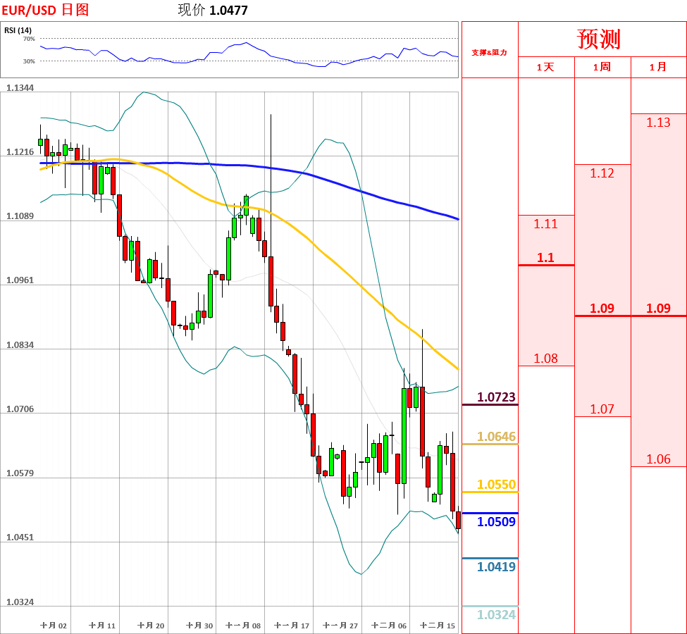 昨日,受到美联储加息的影响,欧元美元大幅下跌,再次创下年内新低,收了带有上下影线的大阴线。目前,中长期均线呈空头排列,短期均线拐头向下,日线动能指标转空,走势总体震荡偏空。今日,上方关注1.0553阻力位,下方关注2015年低点1.0462主要支撑位。如果向上突破1.0553,汇率将会测试5日均线和1.0600主要阻力位;但如若跌破去年低点,下方空间完全打开。今日公布欧元区12月制造业PMI初值。