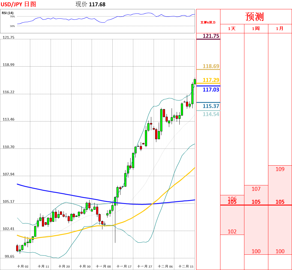 昨日,受到美联储加息的影响,美元/日元一度向上突破116.00和117.00关口,创10个月新高,收了带有上下影线的中阳线,目前,短中期均线呈多头排列,200日均线拐头向上,走势总体震荡偏多。但是,鉴于日线、4小时动能指标超买,因此不排除回调的可能性。今日,上方关注118.00阻力位,下方关注116.00支撑位。如果向上突破118.00,汇率将会测试119.00关口;但如若跌破116.00,美元/日元将跌破5日均线。