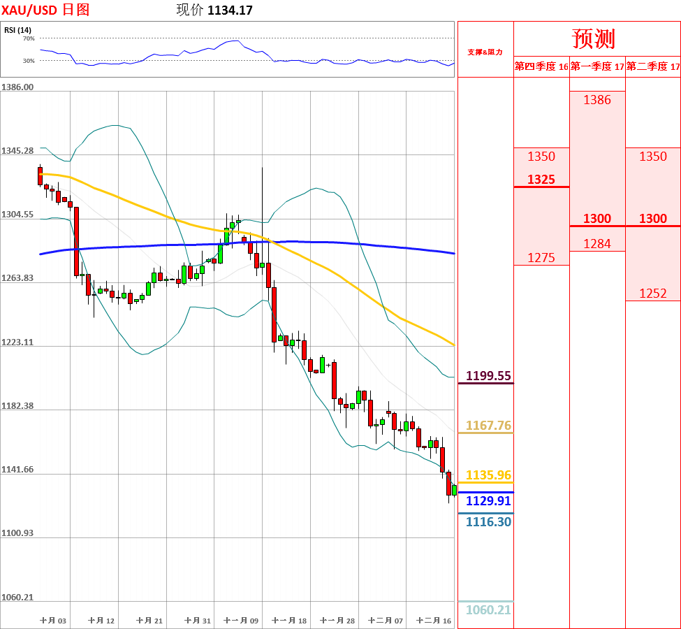 昨日,美元指数创14年新高,黄金一度向下突破1140和1130两大关口,收了带有上下影线的阴线。金价从今年高点1375已经回撤18%,离下跌20%技术性熊市仅一步之遥。目前,短中期均线呈空头排列,100日均线有下穿200日均线的迹象,走势总体震荡偏空。但是,鉴于日线、4小时动能指标超卖后拐头向上,因此不排除反弹的可能性。今日,上方关注1140阻力位,下方关注23.60%回撤率1123主要支撑位。如果向上突破1140,价格将有望突破5日均线;但如若跌破23.60%回撤率,黄金将试探1120关口。