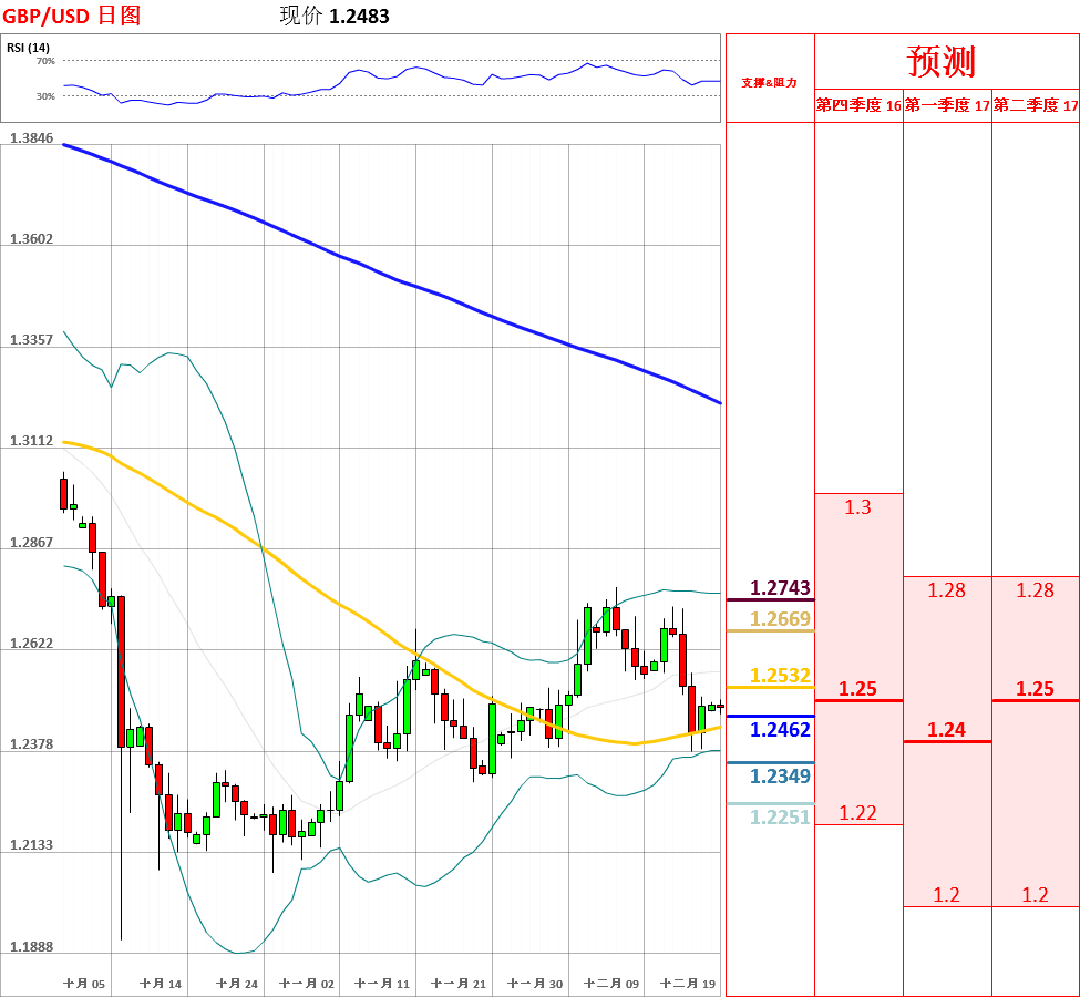 周五,英镑兑美元震荡反弹,收了带有上下影线的阳线,周线收了带有上下影线的阴线。目前,中长期均线呈空头排列,短期均线拐头向下,走势总体震荡偏空。但是,鉴于日线、4小时动能指标发出不同信号,因此不排除区间震荡的可能性。今日,上方关注布林带中轨阻力位,下方关注55日均线支撑位。如果向上突破布林带中轨,汇率将测试10日均线的阻力;但如若跌破55日均线,英镑/美元将试探上周低点1.2376主要支撑位。