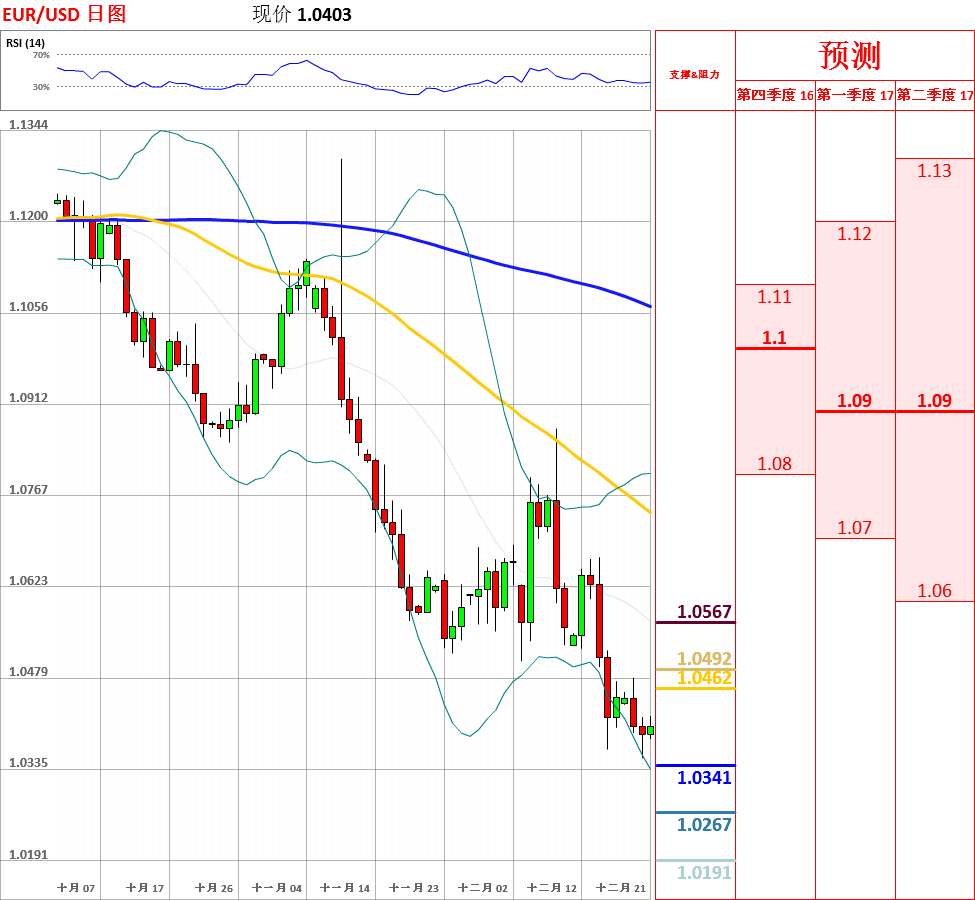 昨日,欧元兑美元震荡下跌,一度向下突破上周低点,创14年新低,收了下影线长于上影线的小阴线。目前,短中长期均线呈空头排列,走势总体震荡偏空。但是,鉴于日线动能指标超卖,4小时MACD出现底背离,因此不排除反弹的可能性。今日,上方关注1.0450阻力位,下方关注上周低点1.0366支撑位。如果向上突破1.0450,汇率将会测试1.0500的阻力;但如若跌破1.0366,欧元/美元将试探昨日低点1.0352主要支撑位。