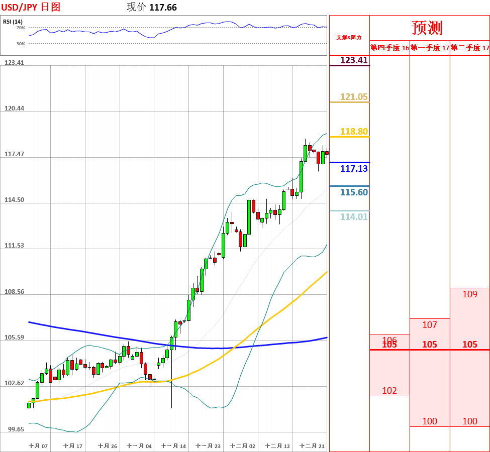 昨日,美元兑日元震荡上行,收了上影线长于下影线的阳线。目前,短中期均线呈多头排列,200日均线拐头向上,走势总体震荡偏多。但是,鉴于4小时动能指标转空,日线动能指标超买后拐头向下,因此不排除回调的可能性。今日,上方关注昨日高点118.24阻力位,下方关注117.00支撑位。如果向上突破118.24,汇率将会测试上周高点118.67主要阻力位;但如若跌破117.00,美元/日元将试探10日均线的支撑。