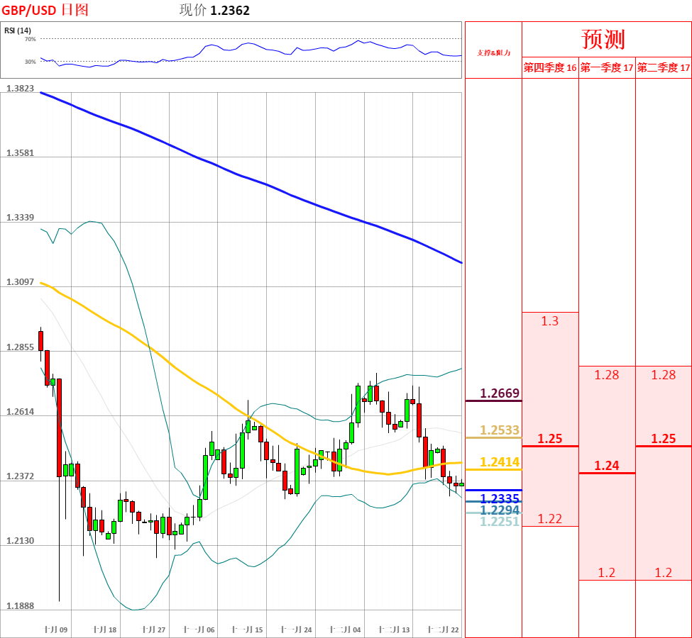 昨日,英镑兑美元窄幅震荡于1.2324至1.2390,收了带有上下影线的小阴线。目前,中长期趋势仍旧偏空,短期均线形成空头排列,走势总体震荡偏空。但是,鉴于日线动能指标超卖后拐头向上,4小时动能指标转多,因此不排除反弹的可能性。今日,上方关注55日均线阻力位,下方关注本周低点1.2312支撑位。如果向上突破55日均线,汇率将会测试10日均线及布林带中轨主要阻力位;但如若跌破1.2312,英镑/美元将试探1.2300和1.2250主要支撑位。