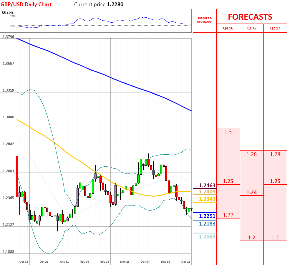 周五,英镑兑美元窄幅震荡于1.2228至1.2299,收了十字星线,周线收了阴线。目前,空头趋势保持完好,但日线、4小时动能指标拐头向上,因此不排除反弹的可能性。今日,上方关注5日均线阻力位,下方关注上周低点1.2228支撑位。如果向上突破5日均线,汇率将测试55日均线主要阻力位;但如若跌破1.2228,英镑/美元将试探1.2200的支撑。