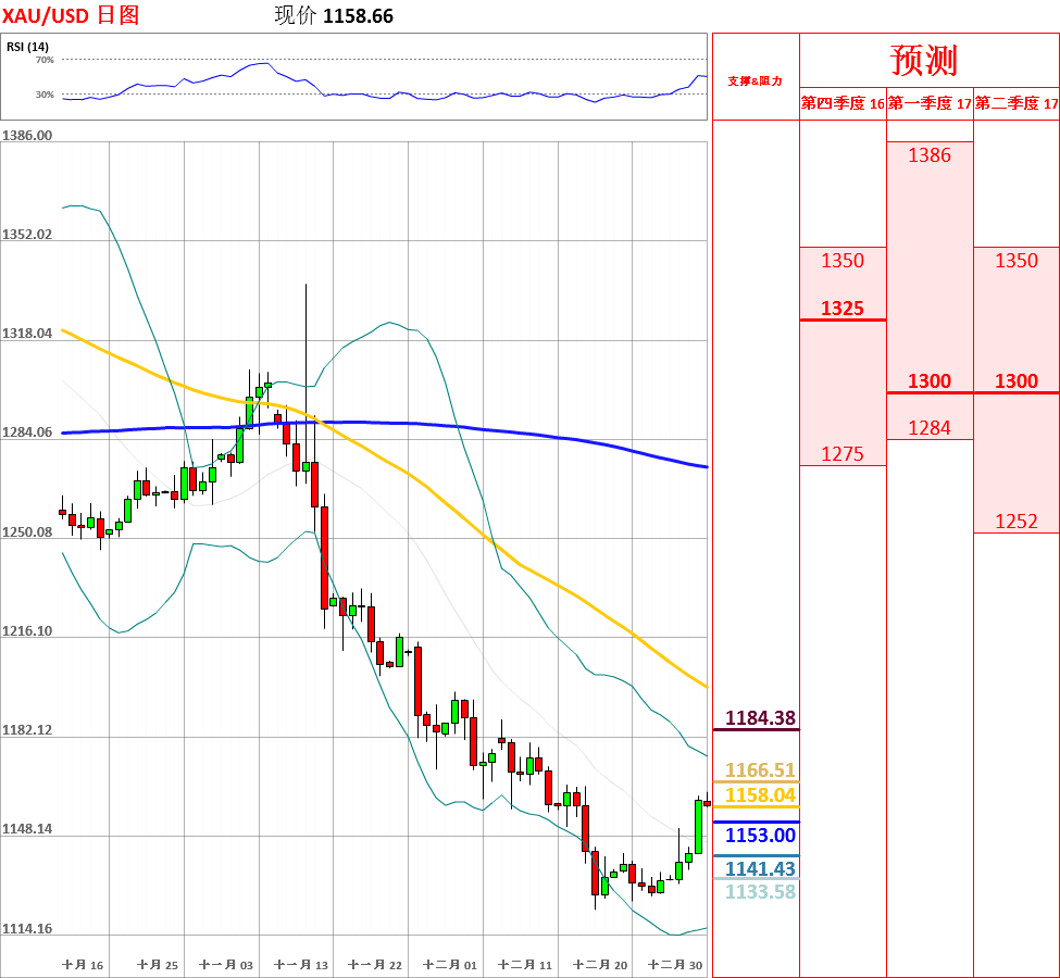 昨日,美国续请失业金人数创7年新高,11月贸易逆差创2015年3月来最大,受此影响美元大幅回调,黄金一度向上突破20日均线和布林带中轨,收了中阳线。目前,均线系统依然呈空头排列,走势总体震荡偏空。但是,鉴于5日与10日均线形成金叉,日线动能指标转多,因此不排除继续反弹的可能性。今日,上方关注1170主要阻力位,下方关注布林带中轨支撑位。如果向上突破1170,金价将会测试1175和1180关口;但如若跌破布林带中轨,黄金将试探短期均线系统的支撑。