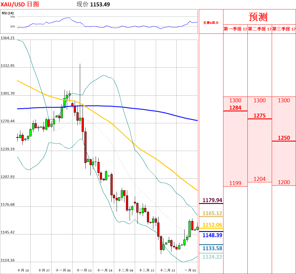 周五,黄金先涨后跌,收了带有上影线的阴线,周线收了带有上影线的阳线,昨日休市。目前,走势总体以震荡下跌为主,但鉴于短期均线拐头向上,因此不排除继续反弹的可能性。今日,上方关注周五高点1163.20阻力位,下方关注布林带中轨支撑位。如果向上突破1163.20,金价将会测试1170.00主要阻力位;但如若跌破布林带中轨,黄金将试探短期均线的支撑。今日公布美国12月Markit制造业PMI终值和12月ISM制造业PMI。