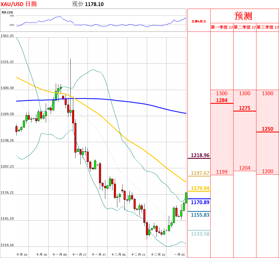 昨日,美元走弱,黄金震荡反弹,收了上影线长于下影线的小阳线。目前,中长期均线呈空头排列,走势总体震荡偏空。但是,鉴于现价已然向上突破1170.00主要阻力位,日线、4小时动能指标转多,因此不排除继续反弹的可能性。今日,上方关注1175.00阻力位,下方关注1170.00支撑位。如果向上突破1175.00,金价将会测试1180.00关口;但如若跌破1170.00黄金将跌至5日均线附近。今日公布美国12月ADP就业人数、至12月31日当周初请失业金人数、12月Markit服务业PMI终值和12月ISM非制造业PMI。