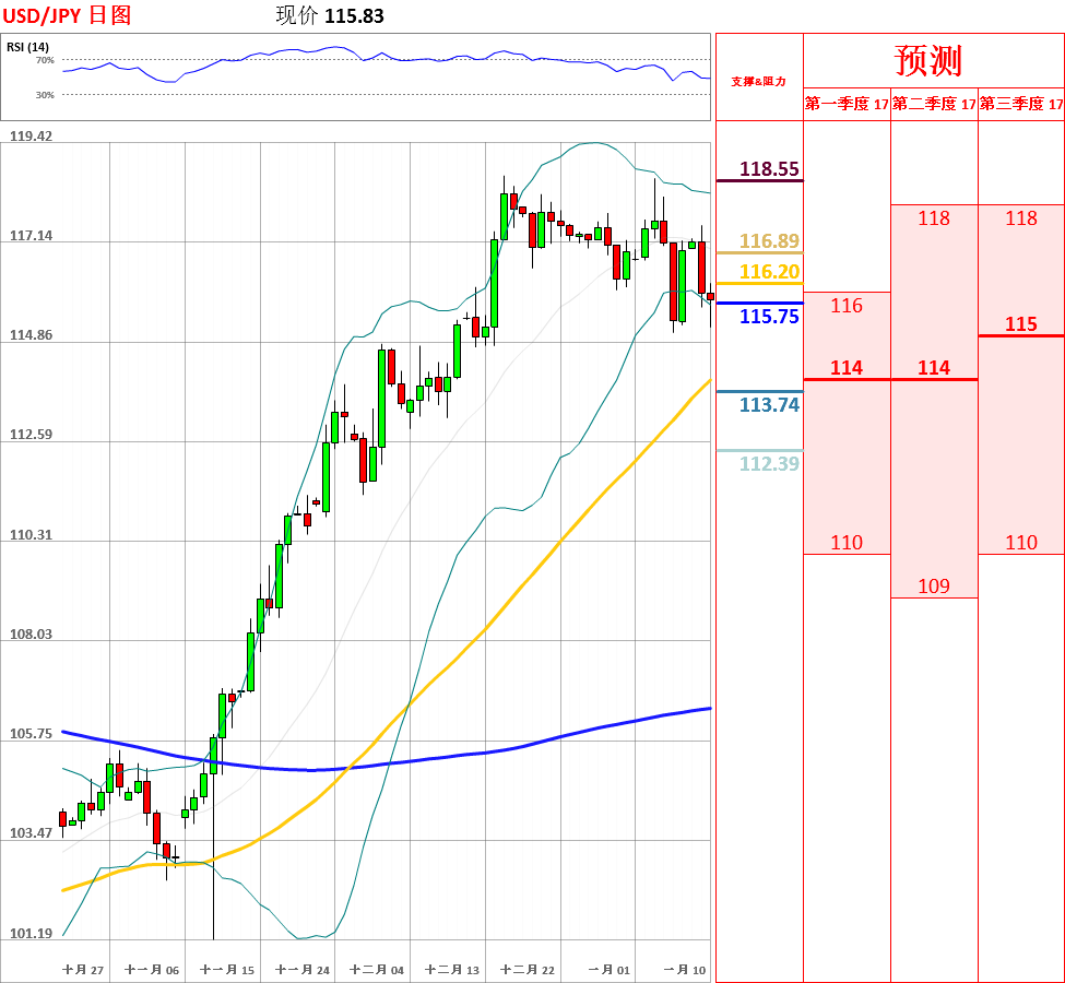 昨日,美元兑日元单边下跌,一度向下突破收了带有上影线的阴线。目前,中长期均线呈多头排列,走势总体震荡偏多。但是,鉴于短期均线形成空头排列,因此不排除继续回调的可能性。今日,上方关注布林带中轨阻力位,下方关注上周低点115.07主要支撑位。如果向上突破布林带中轨,汇率将测试短期均线的阻力;但如若跌破115.07,美元/日元将试探布林带下轨支撑位。