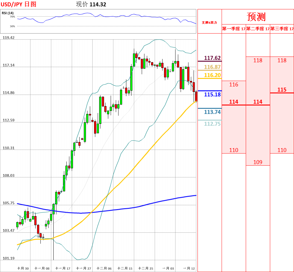 昨日,美元兑日元上涨至20日均线附近后大幅回调,收了带有长上下影线的小阴线。目前,中长期均线呈多头排列,走势总体震荡偏多。但是,鉴于短期均线形成空头排列,日线K线形态出现双顶反转形态,日线、4小时动能指标转空,因此不排除继续回调的可能性。今日,上方关注5日均线阻力位,下方关注昨日低点114.25支撑位。如果向上突破5日均线,汇率将测试布林带中轨和10日均线阻力位;但如若跌破114.25,美元/日元将试探114.00关口。