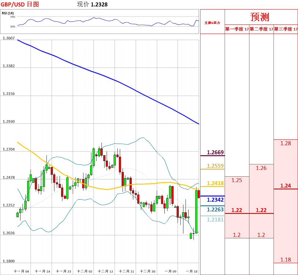 昨日,英国首相就退欧的发言并没有市场预期的那样硬脱欧,英镑兑美元大幅反弹3%,一度向上突破短期均线和布林带中轨,收了大阳线。目前,趋势仍然偏空,但鉴于短期均线和日线动能指标拐头向上,因此不排除继续反弹的可能性。今日,上方关注55日均线阻力位,下方关注布林带中轨支撑位。如果向上突破55日均线,汇率将测试1.2500关口;但如若跌破布林带中轨,英镑/美元将试探短期均线系统的支撑。今日公布 英国12月失业率、12月失业金申请人数、11月三个月ILO失业率。