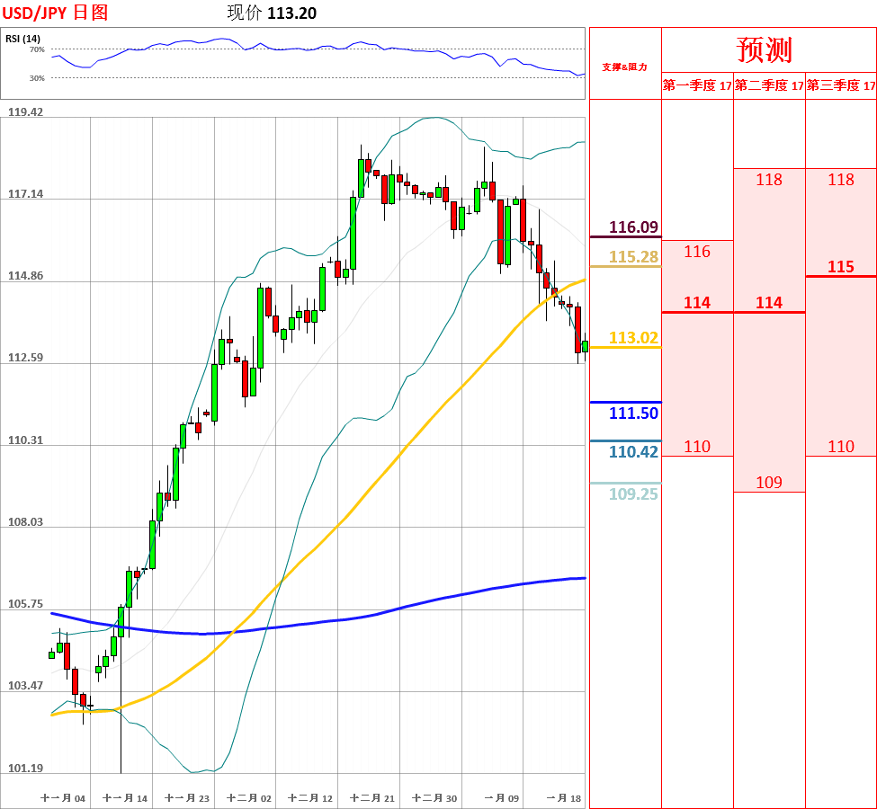 昨日,美元兑日元单边下跌,一度向下突破55日均线,收了中阴线,跌幅为1.29%。目前,中期走势偏多,短期走势偏空,但鉴于日线MACD快线下穿零轴,因此不排除继续下跌的可能性。今日,上方关注55日和5日均线阻力位,下方关注60日均线主要支撑位。如果向上突破55日和5日均线,汇率将测试114.00关口;但如若跌破60日均线,美元/日元将试探112.00支撑位。