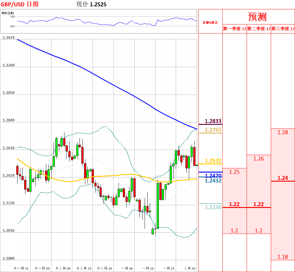 昨日,英国央行决定维持货币政策不变,但表达了对通胀的担忧,随后英镑兑美元下跌,一度向下突破5日和10日均线,收了带有上影线的阴线。目前,短期走势震荡偏多,但鉴于中长期趋势偏空,日线、4小时动能指标转空,因此不排除下跌的可能性。今日,上方关注1.2600阻力位,下方关注100日均线支撑位。如果向上1.2600,汇率将会测试昨日高点1.2706主要阻力位;然而如若跌破100日均线,英镑/美元将试探60日和20日均线的支撑。今日公布英国1月服务业PMI。