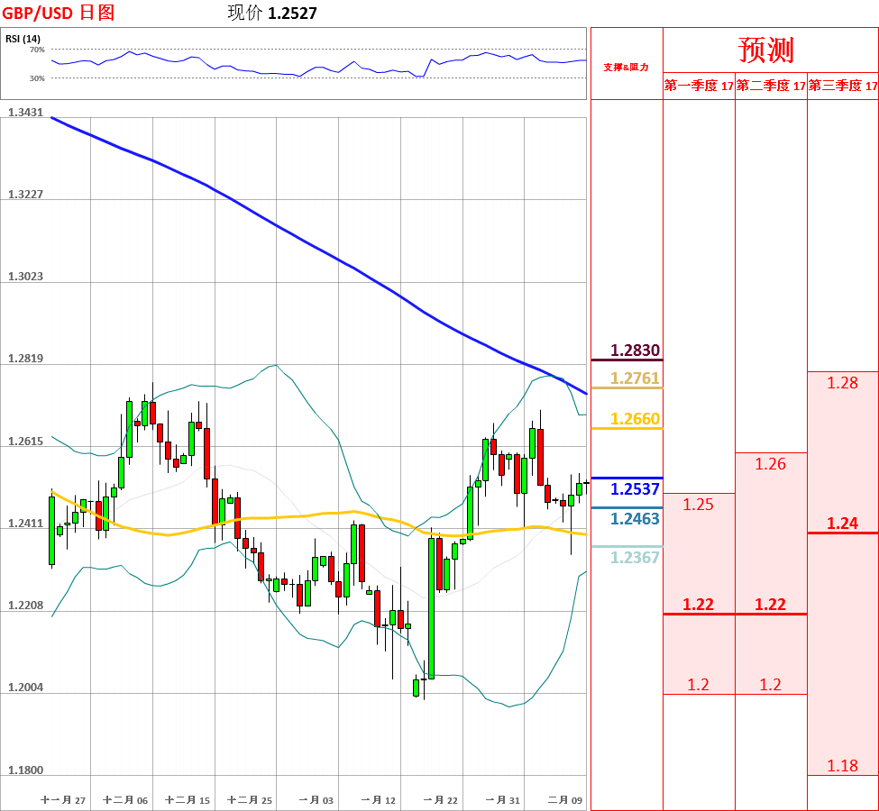 昨日,英镑兑美元震荡反弹,收了带有下影线的小阳线。目前,短中期均线粘合,走势总体以区间震荡为主。但是,鉴于4小时动能指标拐头向下,中长期趋势震荡偏空,因此不排除下跌的可能性。今日,上方关注1.2600阻力位,下方关注布林带中轨支撑位。如果向上突破1.2600,汇率将测试1.2700关口;但如若跌破布林带中轨,英镑/美元将试探60日均线的支撑。