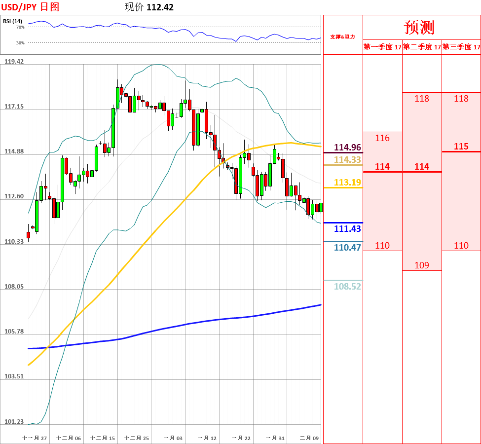 昨日,美元兑日元震荡回落,收了带有上下影线的阴线。目前,短中期均线呈空头排列,走势总体震荡偏空。但是,鉴于4小时动能指标拐头向上,日线动能指标超卖,因此不排除反弹的可能性。今日,上方关注10日均线阻力位,下方关注本周低点111.59支撑位。如果向上突破10日均线,汇率将测试布林带中轨主要阻力位;但如若跌破111.59,美元/日元将试探111.00关口。