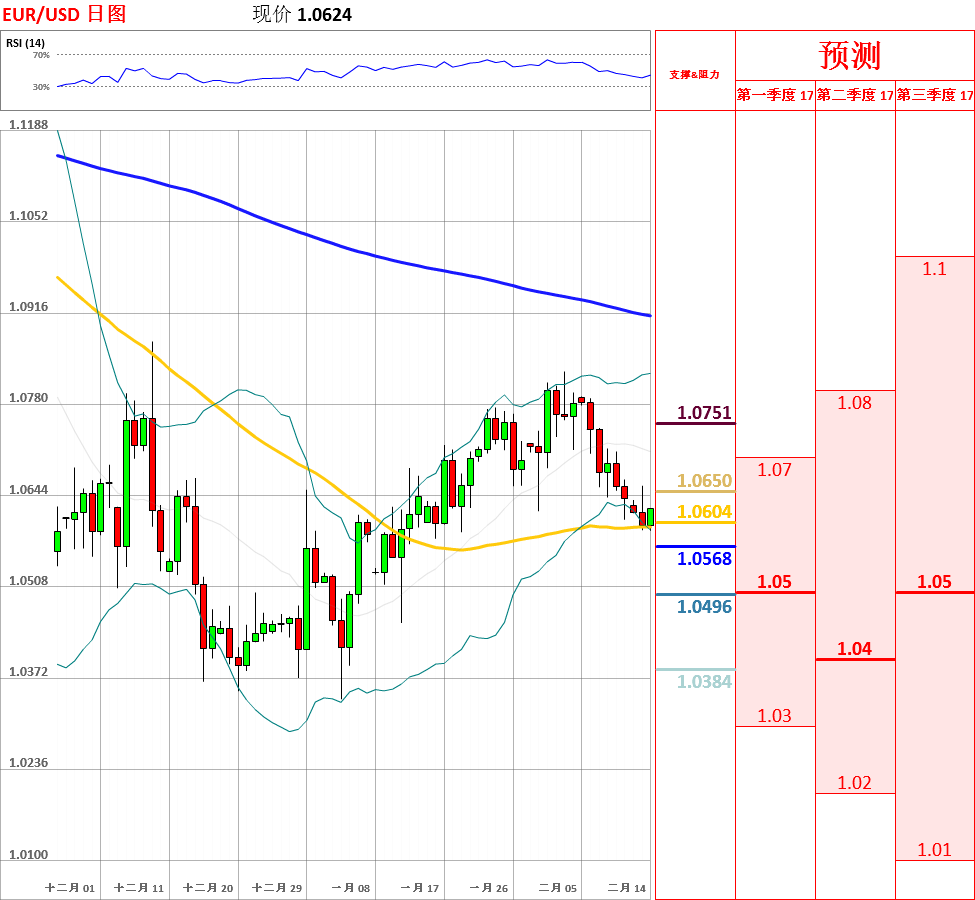 昨日,美元走强,欧元兑美元先涨后跌,一度向下突破60日均线,收了带有长上影线的阴线。目前,短短期均线拐头向下,走势震荡偏空。但是,鉴于4小时、日线动能指标超卖,因此不排除反弹的可能性。今日,上方关注5日均线阻力位,下方关注昨日低点1.0592支撑位。如果向上突破5日均线,汇率将测试昨日高点1.0659阻力位;但如若跌破昨日低点,欧元/美元将试探1.0550主要支撑位。今日公布欧元区第四季度GDP修正值。