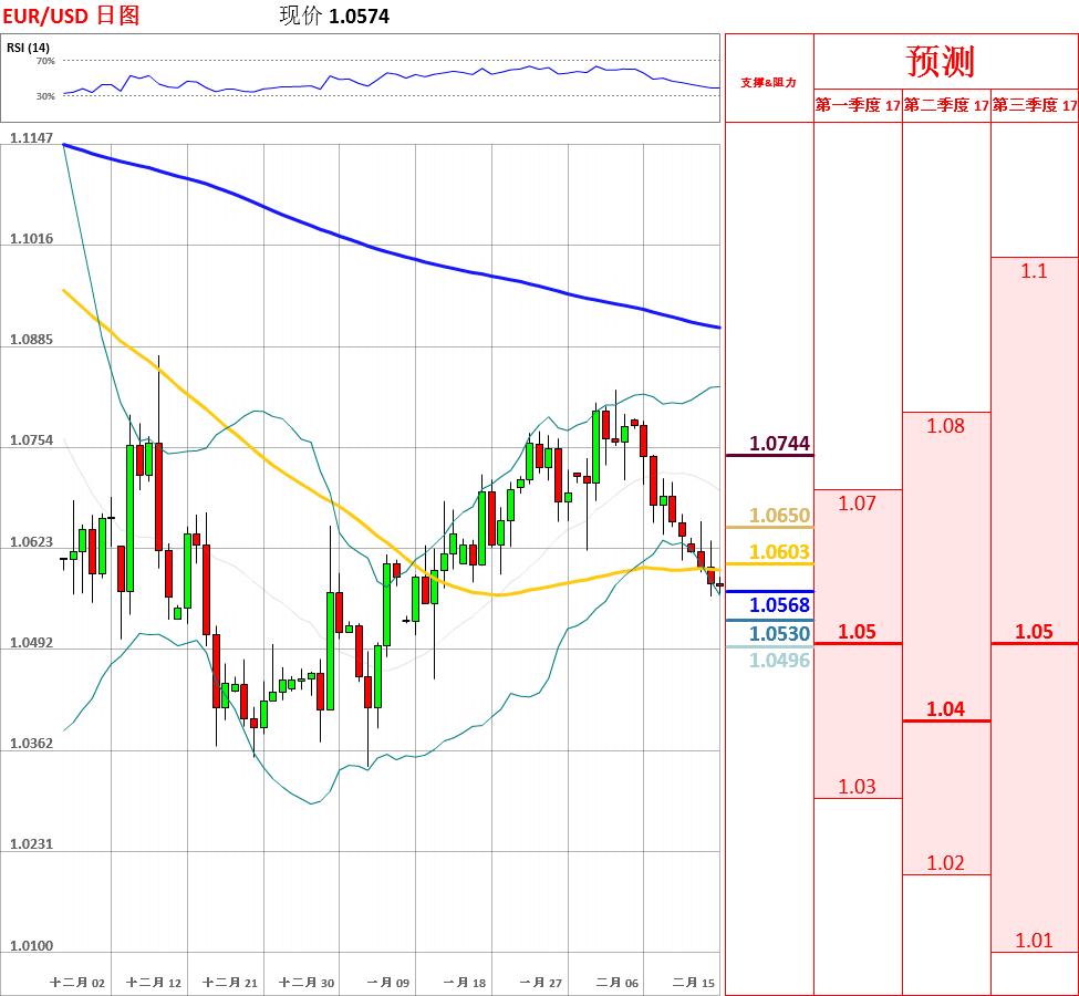 昨日,耶伦在听证会上发出鹰派言论,美元走强,欧元兑美元反弹至5日均线后遇阻下跌,收了上影线长于下影线的阴线。目前,短期均线形成空头排列,走势总体震荡偏空。但是,鉴于日线、4小时动能指标超卖,因此不排除反弹的可能性。今日,上方关注60日均线阻力位,下方关注昨日低点1.0561支撑位。如果向上突破60日均线,汇率将测试昨日高点1.0633的阻力;但如若跌破昨日低点,欧元/美元将试探1.0500支撑位。