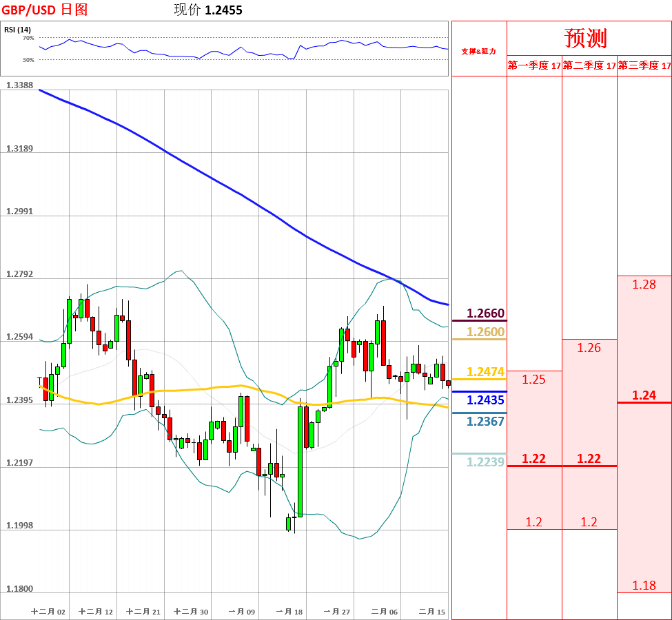 昨日,英镑兑美元震荡下跌,收了阴线。目前,均线粘合,短期走势总体以区间震荡为主。但是,鉴于中长期趋势偏空,日线、4小时动能指标拐头向下,因此不排除继续下跌的可能性。今日,上方关注昨日高点1.2548阻力位,下方关注100日均线主要支撑位。如果向上突破昨日高点,汇率将测试1.2600关口;但如若跌破100日均线,英镑/美元将试探上周低点1.2347支撑位。今日公布英国1月失业率、1月失业金申请人数和12月三个月ILO失业率。