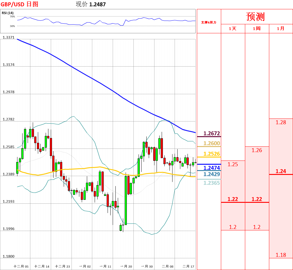 昨日,英镑兑美元窄幅震荡于1.2454至1.2523,收了带有上影线的小阳线。目前,中长期趋势仍旧偏空,但日线MACD基本持平,短期走势总体以区间震荡为主。最近,汇率震荡幅度越来越小,短期内有方向性突破的可能性。今日,上方关注本周高点1.2548阻力位,下方关注100日均线主要支撑位。如果向上突破1.2548,汇率将测试1.2600主要阻力位;但如若跌破100日均线,英镑/美元将试探1.2400关口。今日公布英国1月季调后零售销售月率。