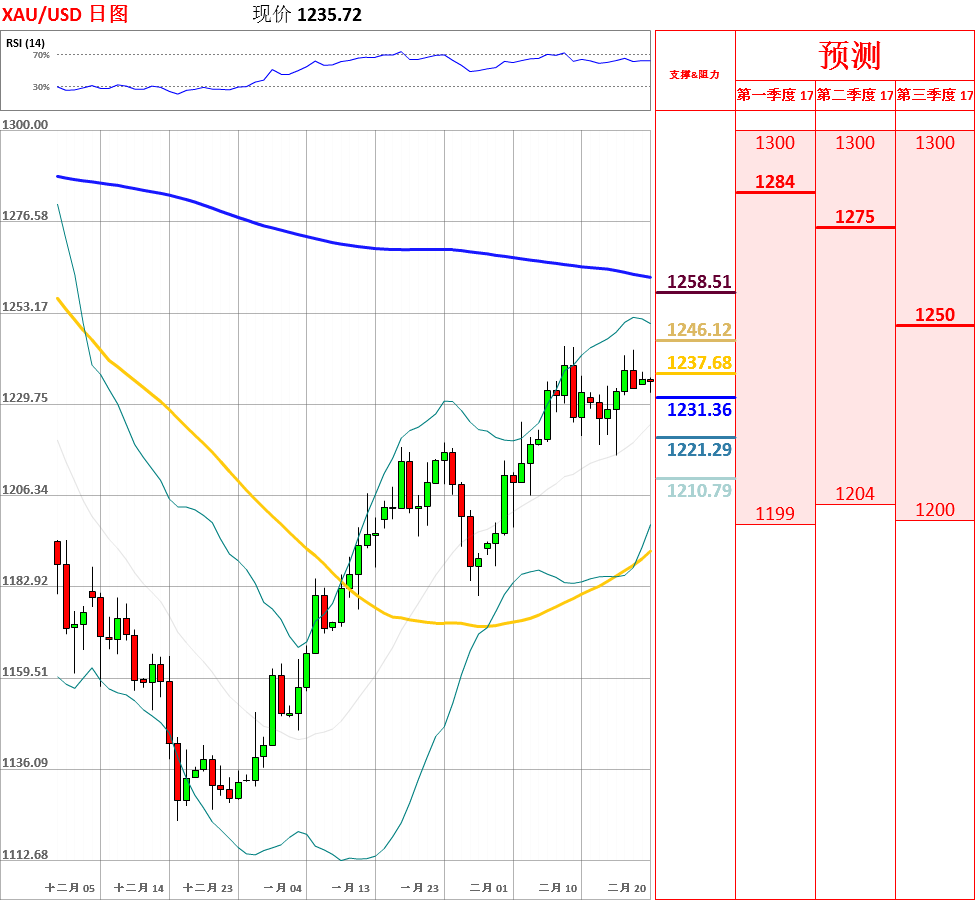 周五,黄金涨至本月高点附近后遇阻回落,收了带有上影线的阴线,周线收了十字星线。目前,短期走势震荡偏多,但鉴于4小时动能指标拐头向下,因此不排除回调的可能性。今日,上方关注1240.00阻力位,下方关注1230.00支撑位。如果向上突破1240.00,金价将再次测试本月高点1244.71主要阻力位;但如若跌破1230.00,黄金将跌至布林带中轨附近。