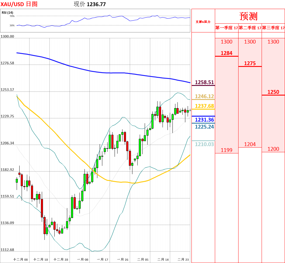 昨日,黄金窄幅震荡于1231.18至1240.33,收了十字星线。目前,短中期均线呈多头排列,走势震荡偏多。但是,鉴于日线、4小时动能指标发出不同信号,因此不排除继续区间震荡的可能性。今日,上方关注1240.00阻力位,下方关注昨日低点1231.18支撑位。如果向上突破1240.00,金价将测试本月高点1244.71主要阻力位;但如若跌破1231.18,黄金将试探布林带中轨主要支撑位。今日公布美国至2月18日当周初请失业金人数。