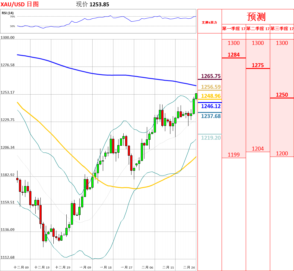 昨日,黄金单边上涨,一度向上突破61.80%回撤率1249.20主要阻力位,收了中阳线,涨幅为1%。目前,短中期均线呈多头排列,走势震荡偏多。但是,鉴于4小时动能指标超买,因此不排除回调的可能性。今日,上方关注昨日高点1251.08阻力位,下方关注5日均线支撑位。如果向上突破昨日高点,金价将测试200日均线主要阻力位;但如若跌破5日均线,黄金将试探10日均线的支撑。今日公布美国2月密歇根大学消费者信心指数终值。