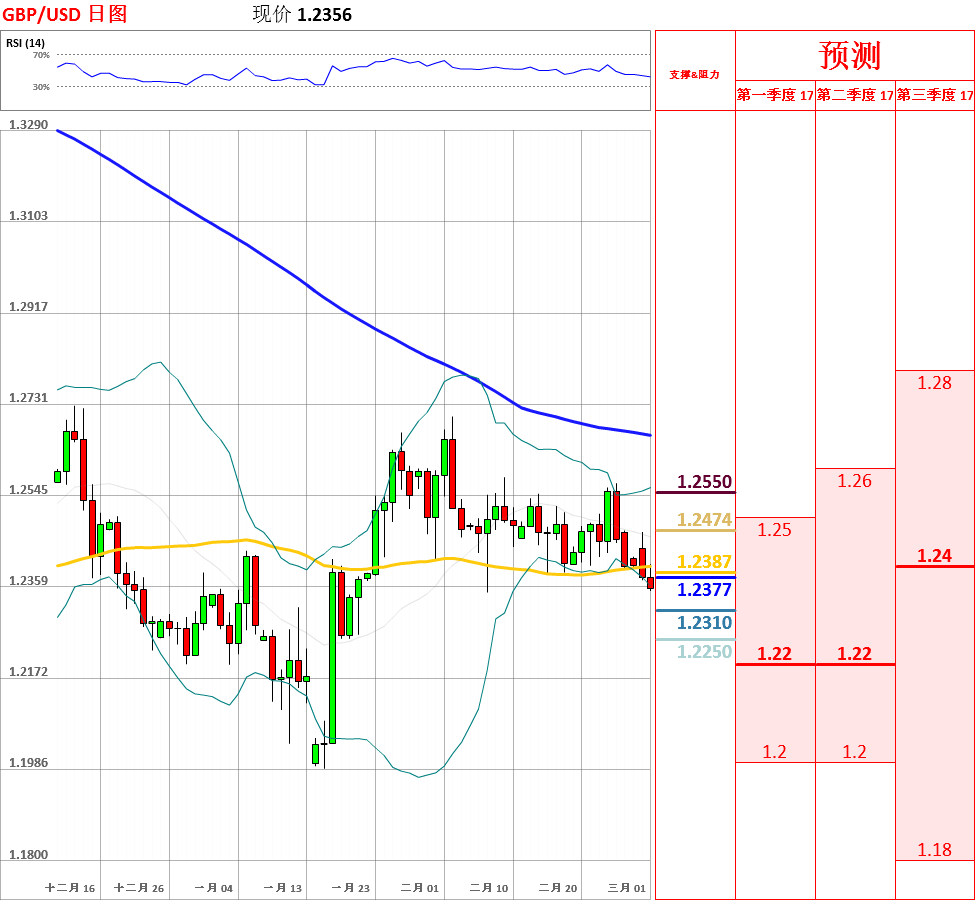 昨日,英镑兑美元先涨后跌,一度向下突破60日和100日均线,且收盘于100日均线下方,收了带有上影线的阴线。目前,中长期趋势偏空,短期走势以区间震荡为主,但鉴于日线动能指标拐头向下。因此不排除进一步下跌的可能性。今日,上方关注100日和60日均线阻力位,下方关注本月低点1.2347主要支撑位。如果向上突破100日、60日均线,汇率将测试布林带中轨和20日均线主要阻力位;但如若跌破1.2347,英镑/美元将试探1.2300关口。今日公布英国2月制造业PMI。